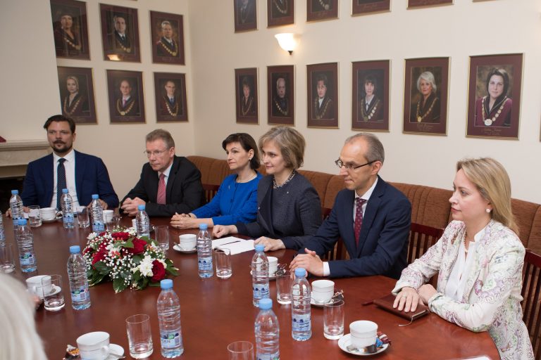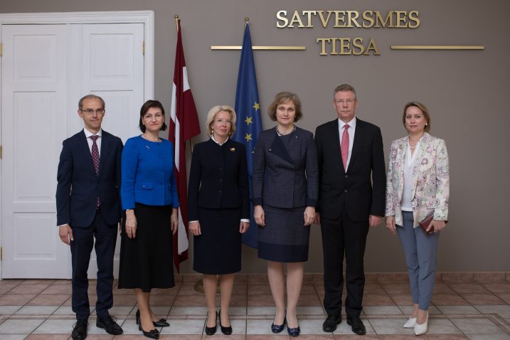 On Tuesday, 21 May, the Speaker of the Saeima Ināra Mūrniece paid an official visit to the Constitutional Court. Ināra Mūrniece and the delegation led by her were received by the President of the Constitutional Court Ineta Ziemele and the Constitutional Court Justices Sanita Osipova, Gunārs Kusiņš, Daiga Rezevska, and Artūrs Kučs. During the meeting, the parties discussed topical issues in relation to the judiciary and to the strengthening of the independence of the Constitutional Court as a constitutional body defined in the Satversme.