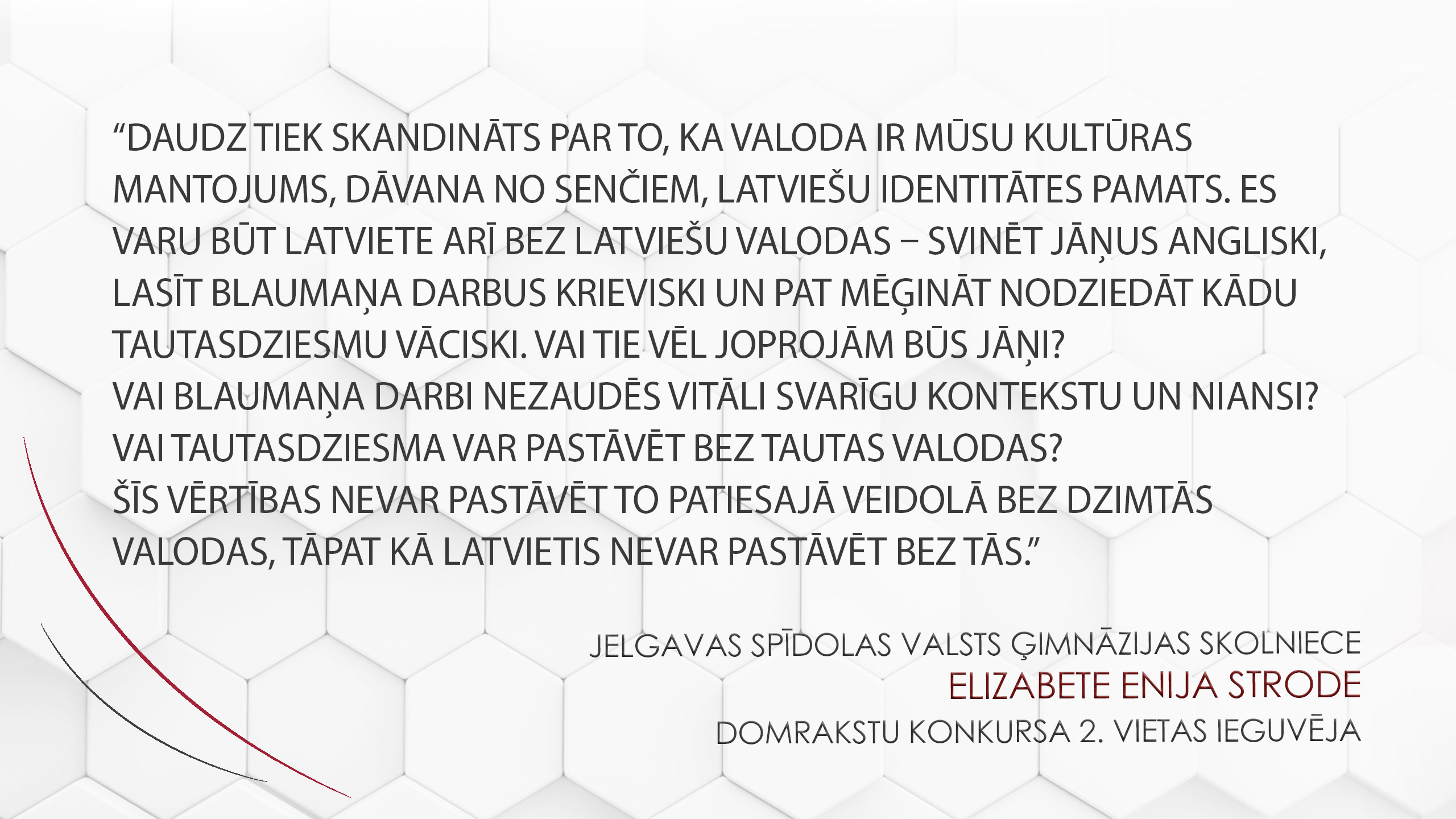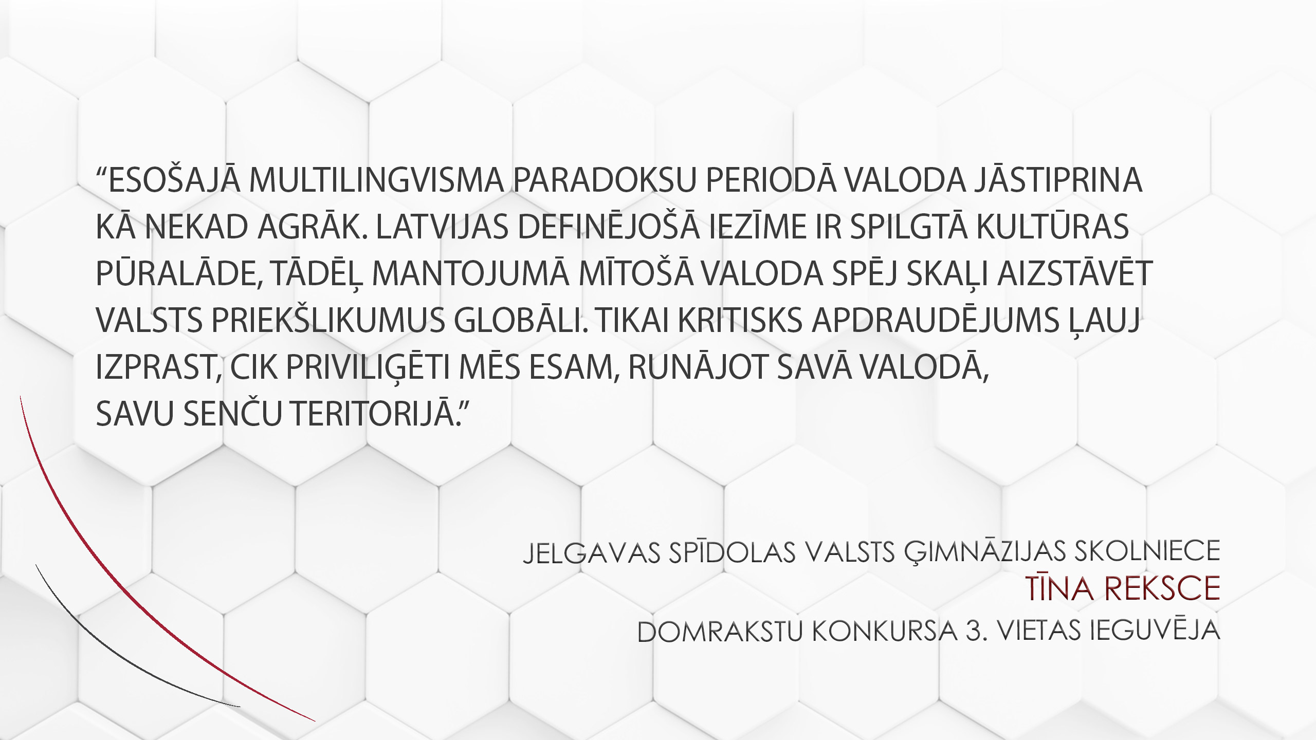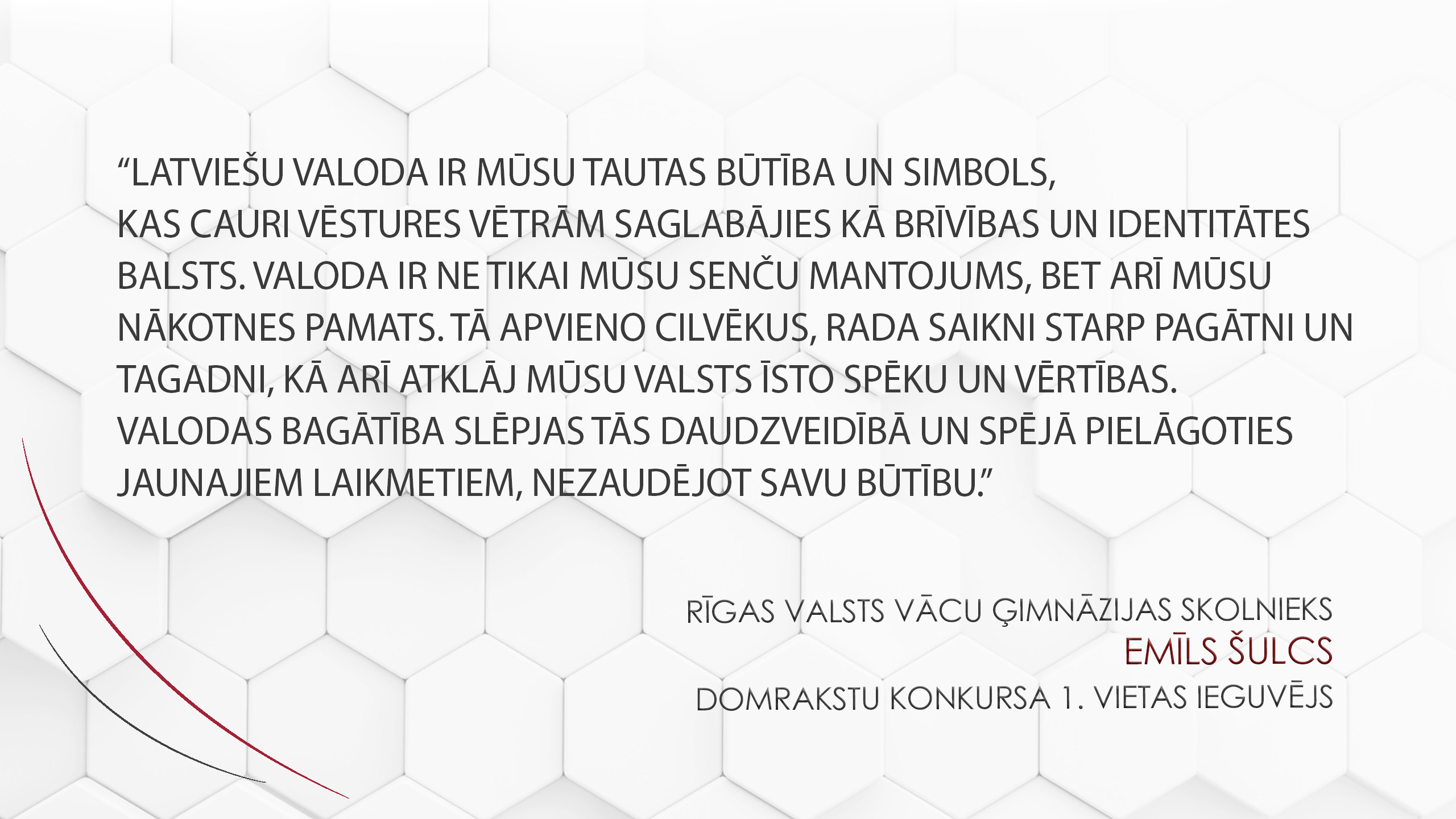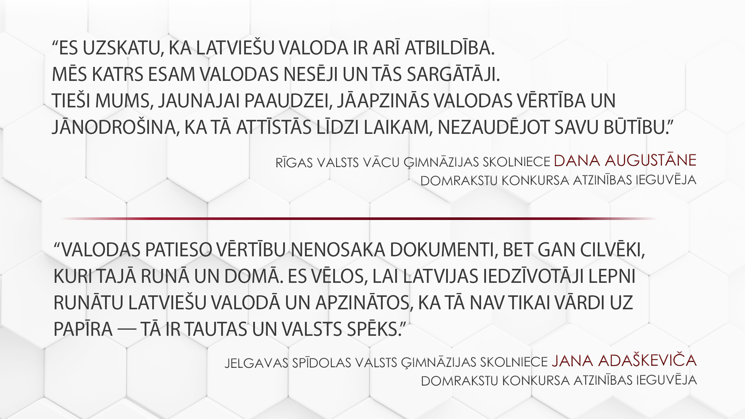 Piektdien, 21. februārī, Satversmes tiesā norisinājās skolēnu radošo darbu konkursa “Valsts valoda – Latvijas kopējā vērtība” uzvarētāju apbalvošanas ceremonija. To caurvija patiesi vērtīgas skolēnu atziņas par to, ka latviešu valoda ir ne tikai mūsu savstarpējās saziņas un demokrātiskās līdzdalības valoda – tā veido Latvijas valsti, tautu un mūs pašus. Ikvienam ir svarīgi apzināties savu atbildību un līdzdalību valsts valodas kopšanā un aizsardzībā.
