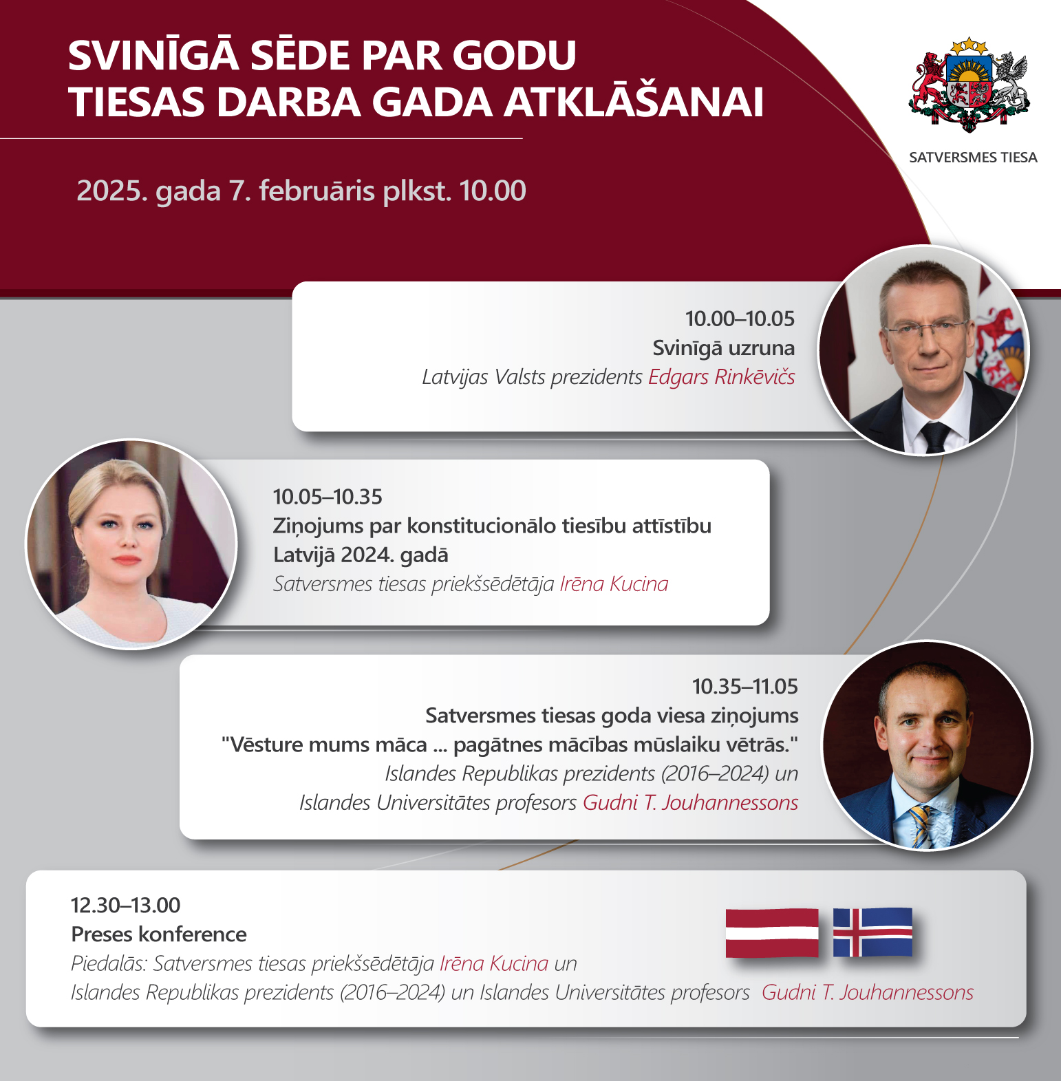Pēc svinīgās sēdes, plkst. 12.30, plašsaziņas līdzekļu pārstāvji aicināti uz preses konferenci, kurā piedalīsies priekšsēdētāja Irēna Kucina un Satversmes tiesas goda viesis Gudni T. Jouhannessons. Darba valoda: latviešu un angļu (sinhronais tulkojums latviešu valodā). Plašsaziņas līdzekļu pārstāvjus, kuri vēlas piedalīties preses konferencē, aicinām pieteikties līdz 5. februārim, rakstot e-pastu Ksenija.Vitola@satv.tiesa.gov.lv vai zvanot +371 67830749.